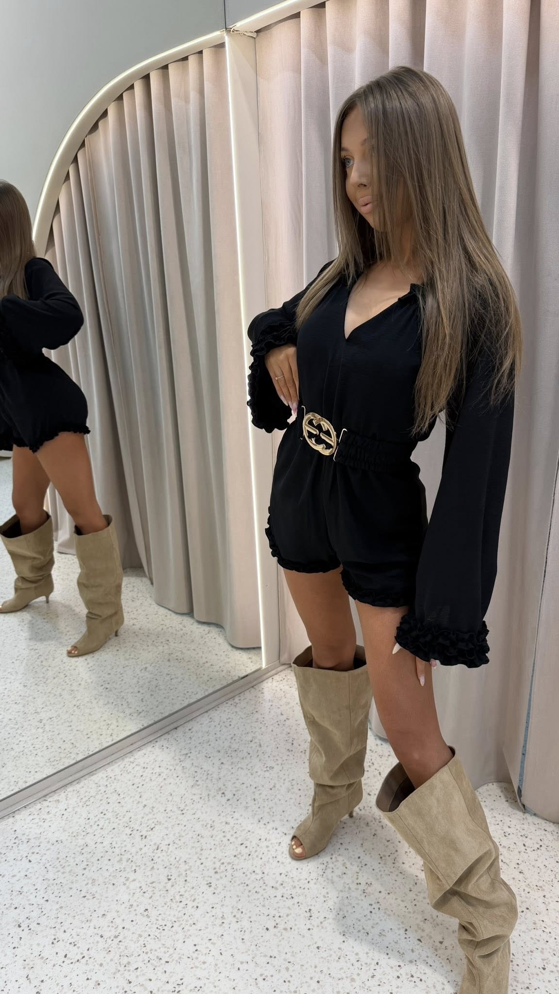 Kombinezon SORELLE z uroczymi falbankami to idealny wybór, jeśli chcesz wyglądać stylowo i kobieco. Pasek pięknie podkreśla talię, a możliwość noszenia go na dwa sposoby daje Ci pełną swobodę stylizacji. Dostępny w rozmiarach S i M – zakochasz się od pierwszego założenia!