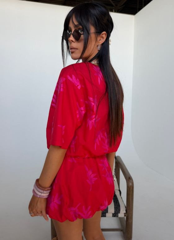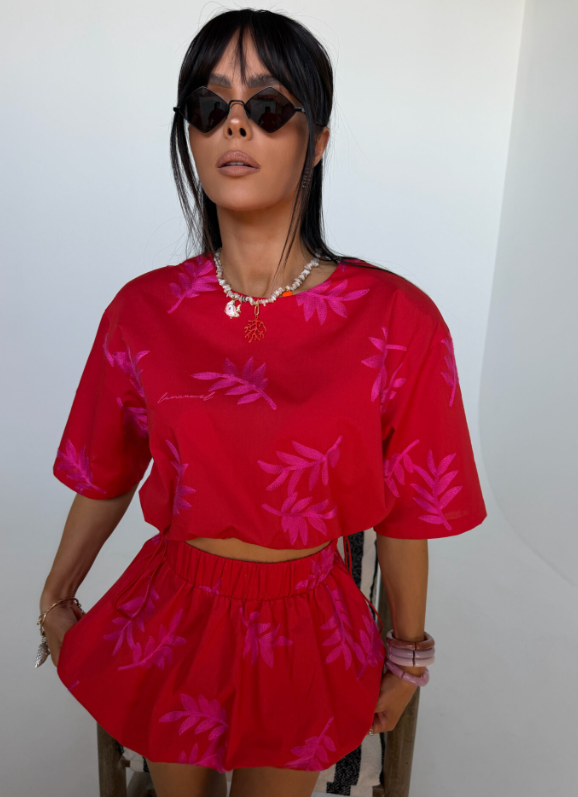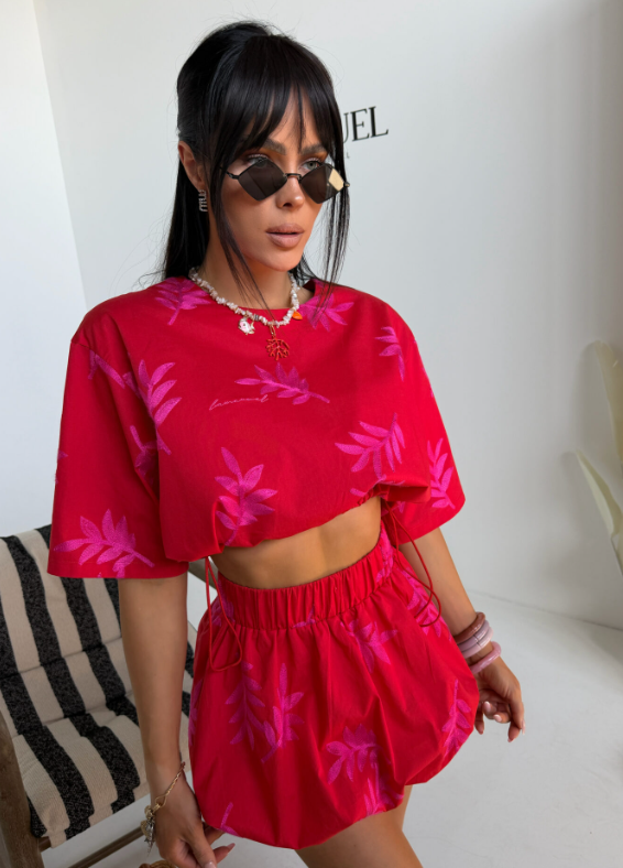 Kolor, który robi efekt od pierwszego spojrzenia. Intensywny odcień w połączeniu z subtelnym, roślinnym wzorem nadaje całości wyrazistego, letniego charakteru. Luźniejsza góra daje swobodę noszenia, a dzięki regulacji gumkami można ją dopasować do sylwetki, podkreślając talię i tworząc bardziej zarysowaną formę. Spódniczka typu bombka dodaje objętości i lekkości, pięknie pracując w ruchu i eksponując nogi. Całość tworzy energetyczny, kobiecy look, który przyciąga uwagę i idealnie wpisuje się w wakacyjny klimat.
