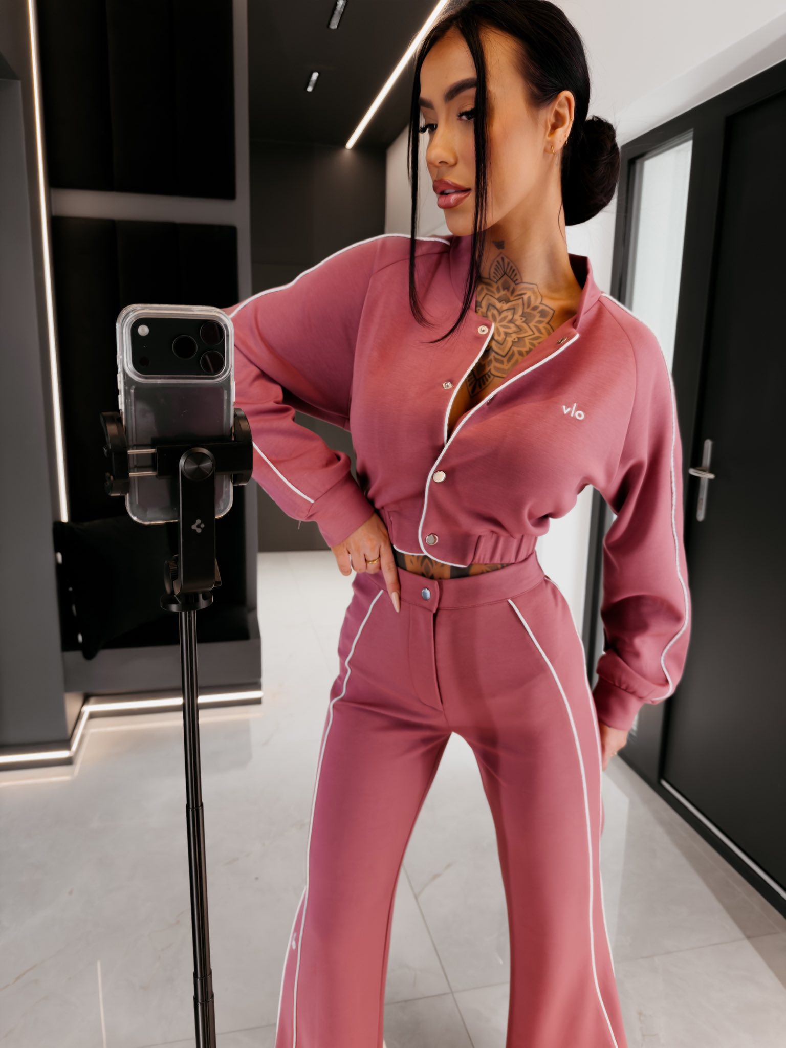 Komplet z miękkiej elastycznej dzianiny - bluza o krótszym fasonie - zapinana na metaliczne napy - długie rękawy zakończone ściągaczami - elastyczne wykończenie talii - spodnie z wysokim stanem - nogawka długa rozszerzana ku dołowi typu flare - spodnie zapinane na metaliczny guzik i zamek - w komplecie wszyty kontrastowy pionowy piping - delikatne haftowane logowania OLV.