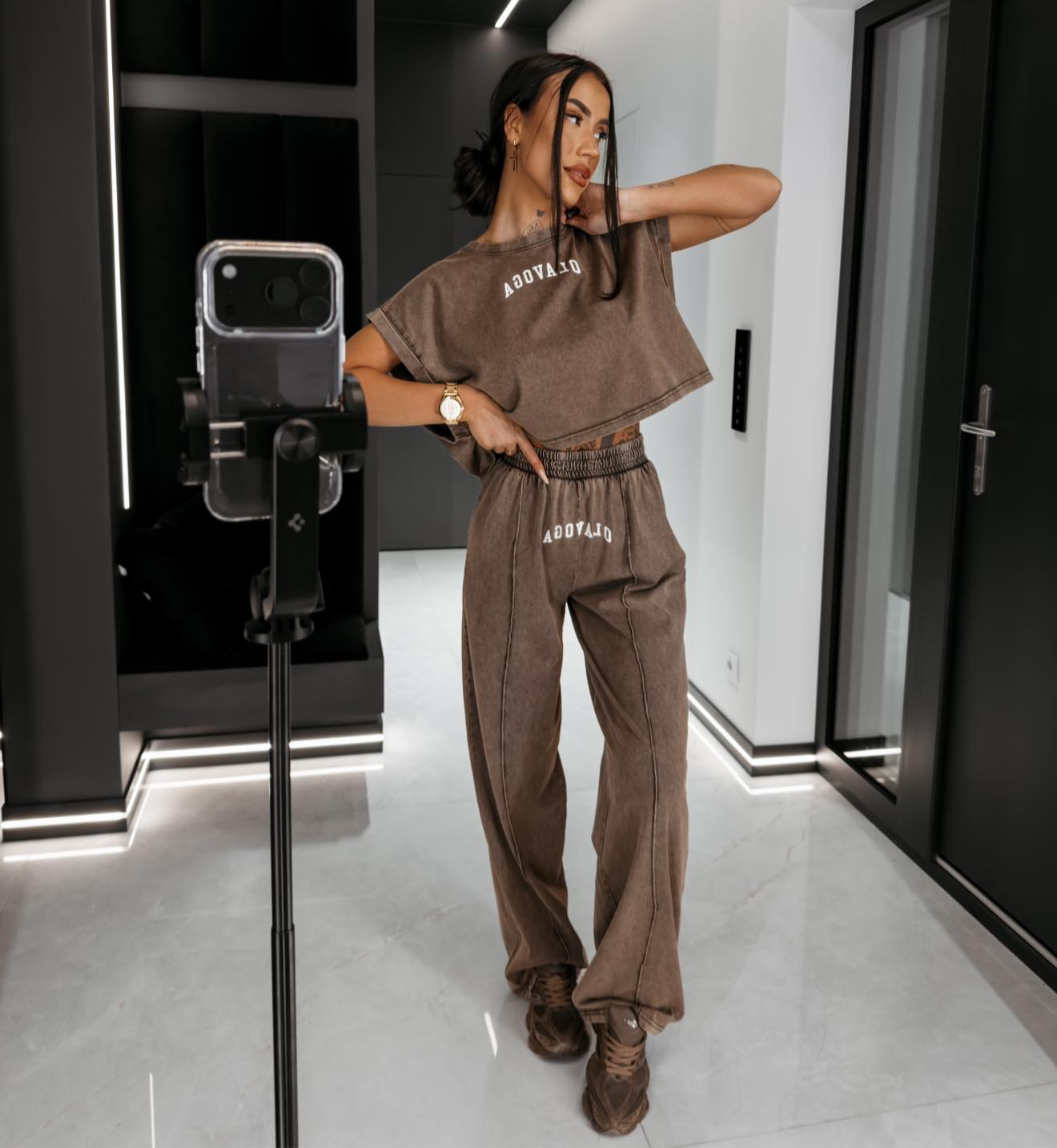 Komplet dwuczęściowy z efektem sprania (washed), krótki T-shirt o luźnym kroju z podwiniętymi rękawami i okrągłym dekoltem, spodnie z wysokim stanem, szeroka nogawka, elastyczna talia na gumie, widoczne przeszycia na nogawkach, nadrukowane logo na przodzie koszulki i na spodniach.