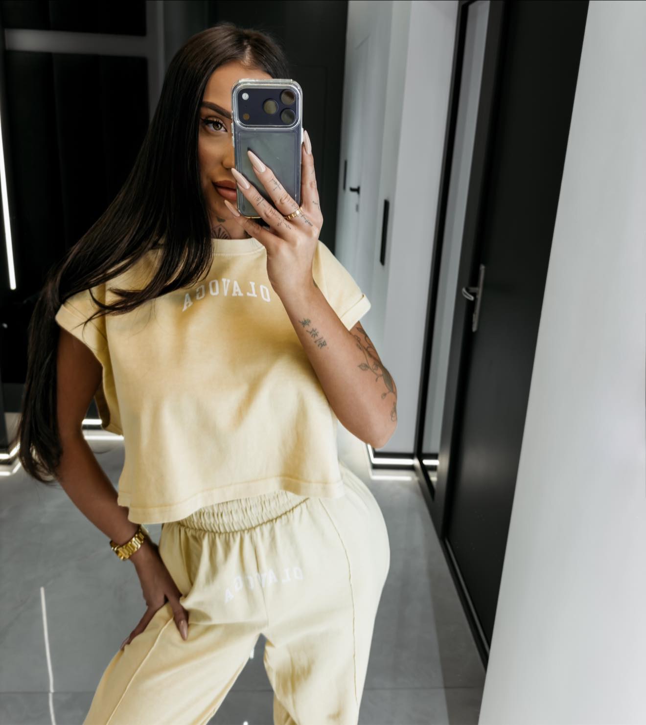 Komplet z wysokogatunkowej bawełny o gramaturze 270g - krótki top o luźnym kroju boxy - szerokie rękawy typu cap sleeve - okrągły dekolt - spodnie z wysokim stanem i elastyczną talią - długa, szeroka nogawka z przeszytym kantem - washed effect na całości - sitodruk z kontrastowym logo brandu na topie i spodniach.