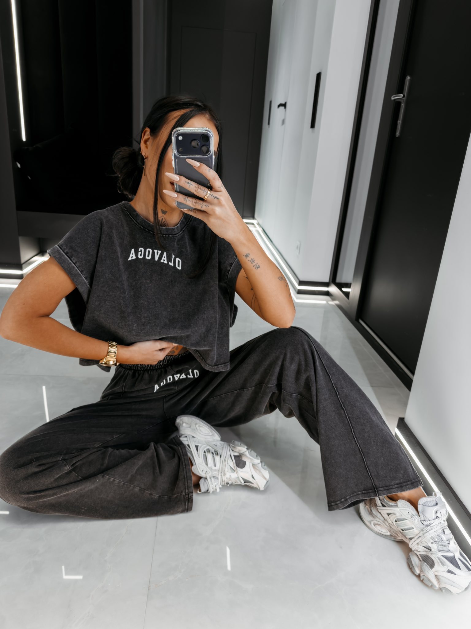 Komplet z wysokogatunkowej bawełny o gramaturze 270g - krótki top o luźnym kroju boxy - szerokie rękawy typu cap sleeve - okrągły dekolt - spodnie z wysokim stanem i elastyczną talią - długa, szeroka nogawka z przeszytym kantem - washed effect na całości - sitodruk z kontrastowym logo brandu na topie i spodniach.