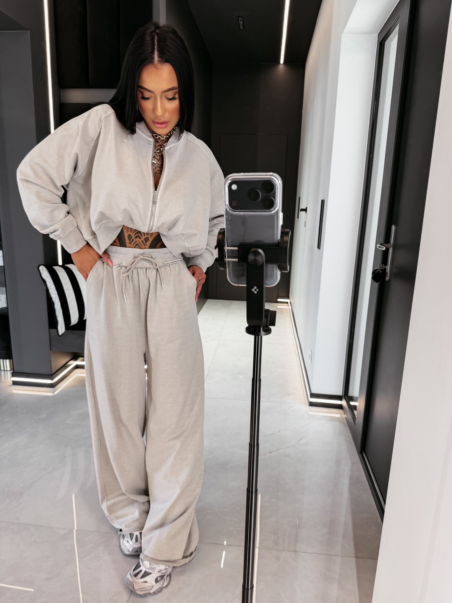 Komplet dresowy. Bluza o krótszym kroju zapinana na zamek, z obniżoną linią ramion. Spodnie z wysokim stanem i regulacją w pasie, z kieszeniami.