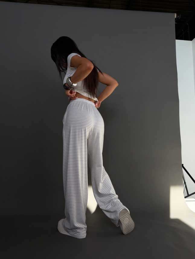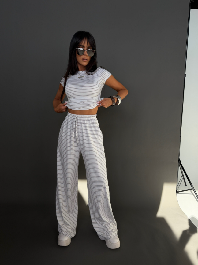 Komplet z miękkiej, lejącej wiskozy, która nadaje całości lekki i swobodny charakter. Dłuższy top o klasycznym kroju dobrze układa się na sylwetce i stanowi zbalansowaną górę dla luźniejszych spodni. Delikatne paski podkreślają casualowy styl modelu, a szeroka nogawka dodaje mu luzu i nowoczesnej formy. To wygodny, gotowy look, który nie wymaga wielu dodatków.
