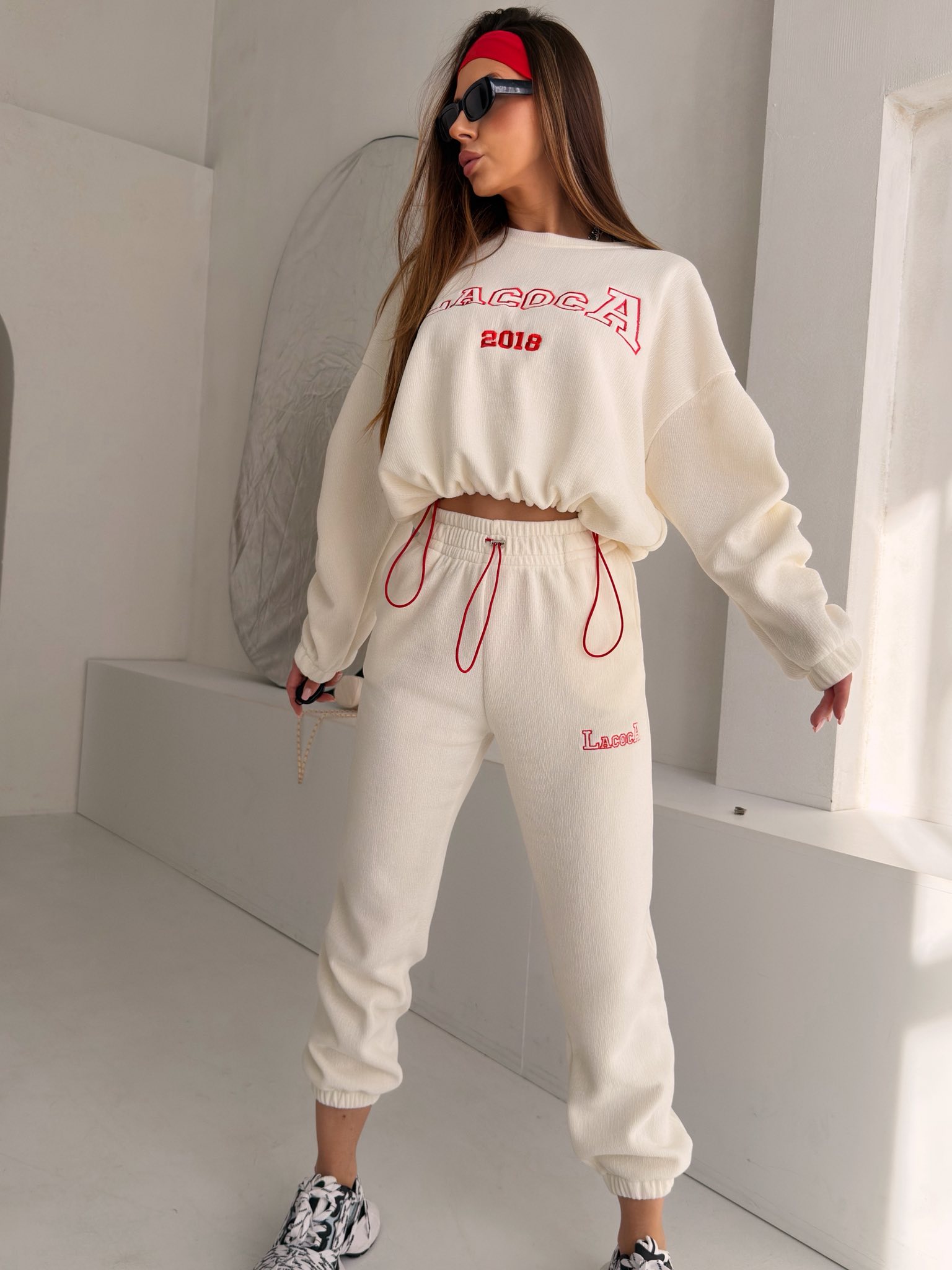 Stylowy komplet dresowy składający się z bluzy oraz spodni z gumką w pasie. Świetny, modny fason, który idealnie sprawdzi się zarówno na co dzień, jak i w casualowych stylizacjach. Miękki, wygodny materiał i modny krój gwarantują komfort oraz świetny look.