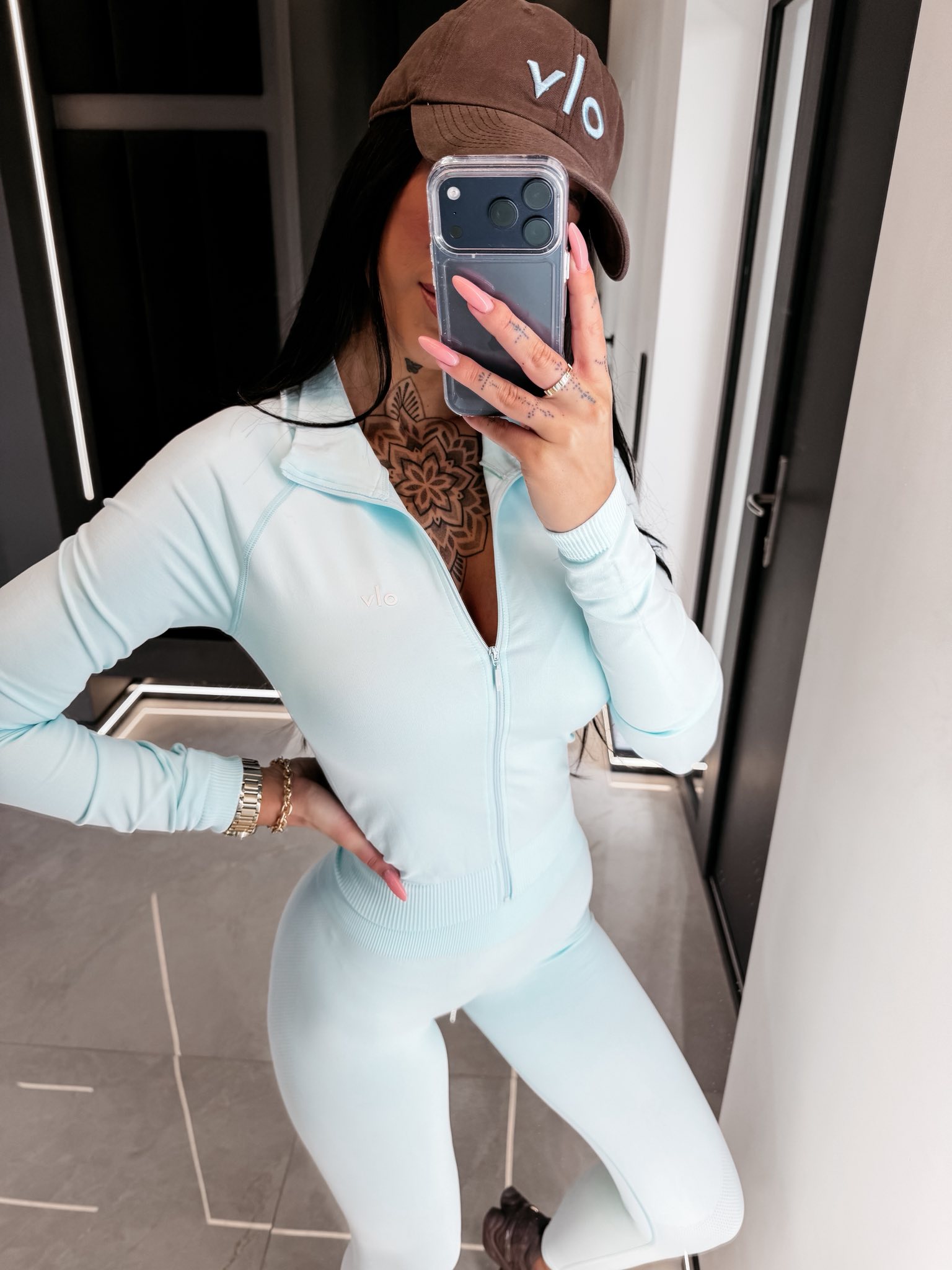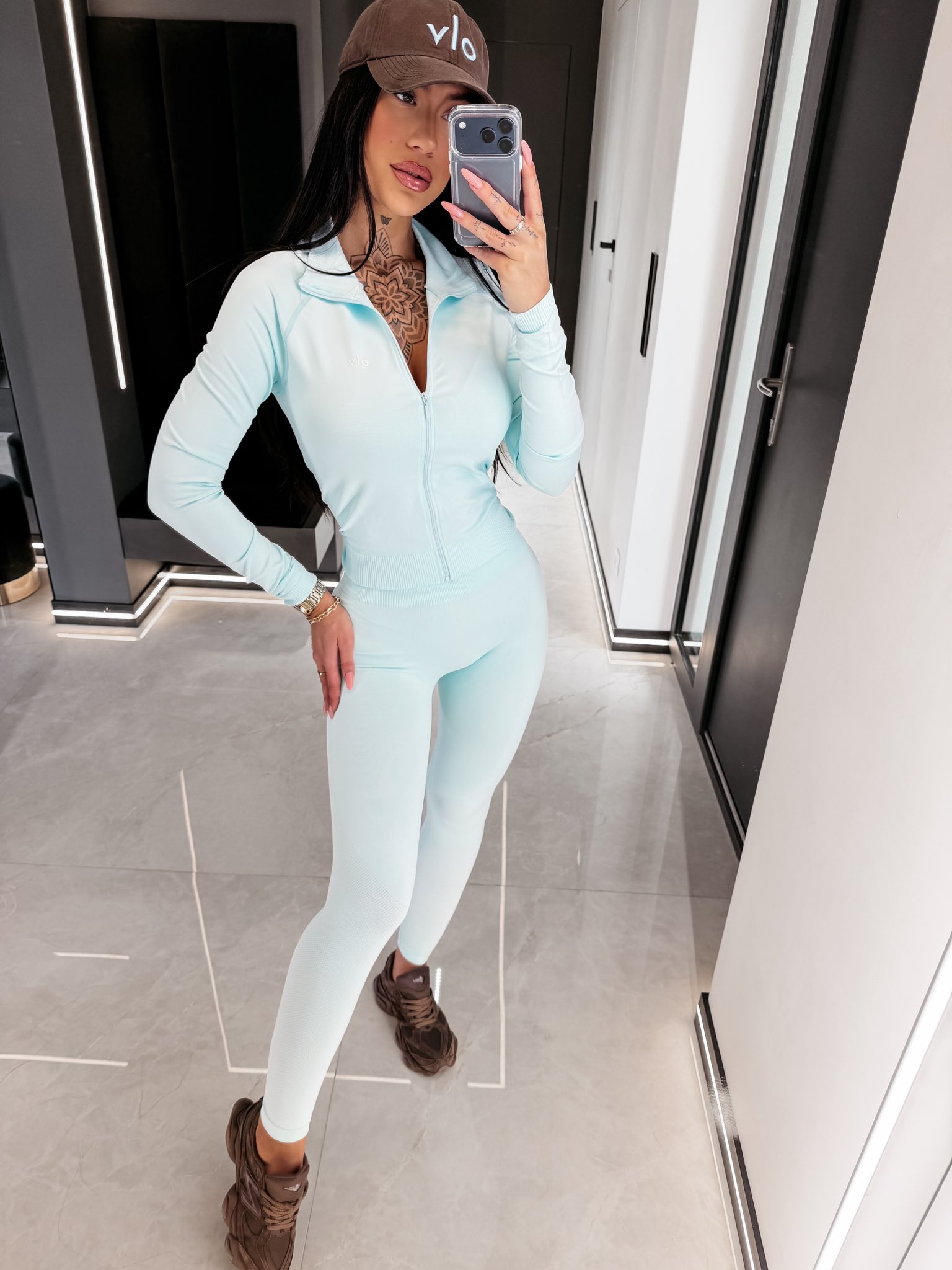 Dopasowany komplet sportowy. Bluza z długim rękawem zapinana na suwak. Legginsy z wysokim stanem. Wykonany z elastycznego materiału dopasowującego się do sylwetki. Subtelne logo.