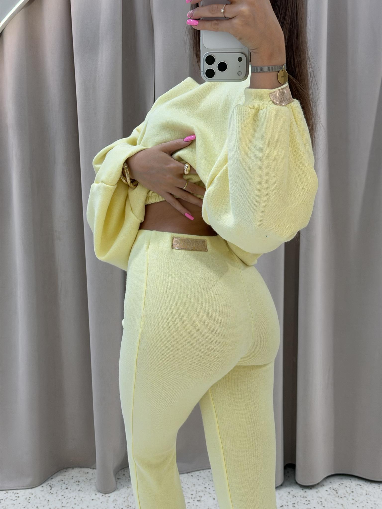 Stylowy komplet dresowy w pastelowych odcieniach, który łączy wygodę z nowoczesnym designem. Bluza o luźnym kroju, spodnie z wysokim stanem i lekko rozszerzaną nogawką pięknie wysmuklają sylwetkę oraz zapewniają komfort noszenia przez cały dzień. Idealny dla wysokich dziewczyn.