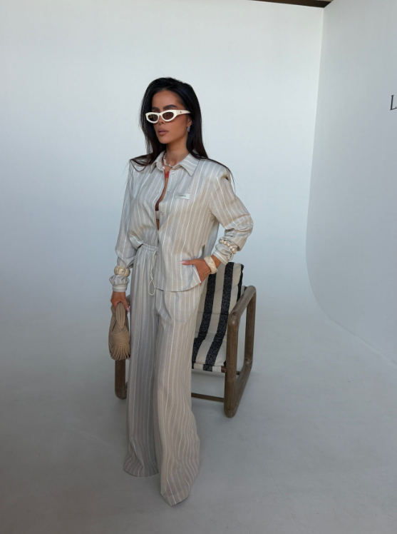 Elegancja w swobodnym wydaniu, która buduje sylwetkę już samą formą. Strukturalna góra z wyraźnie zaznaczoną linią ramion nadaje całości charakteru i pewności siebie. Koszula o dopracowanym kroju idealnie współgra ze spodniami z wysokim stanem, tworząc proporcje, które wydłużają i wysmuklają sylwetkę. Naturalna tkanina na bazie wiskozy, bawełny i lnu zapewnia lekkość oraz komfort noszenia nawet w cieplejsze dni. Subtelny wzór w pionowe pasy dodaje elegancji, a jednocześnie zachowuje nowoczesny, niewymuszony styl. Komplet, który sprawdzi się zarówno w codziennym ruchu, jak i w bardziej dopracowanych stylizacjach.