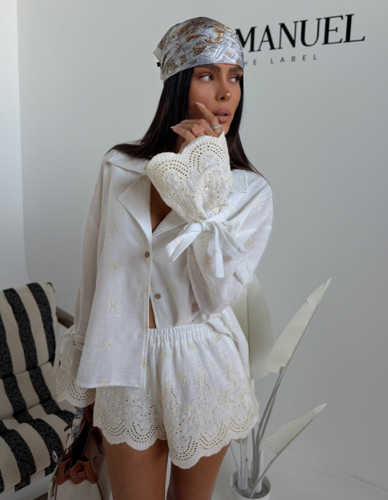 Lekkość, która przyciąga detalem. Zwiewna koszula o luźnym kroju subtelnie układa się na sylwetce, tworząc naturalny, niewymuszony efekt, a haftowane wykończenia dodają całości romantycznego charakteru. Szerokie rękawy zakończone ozdobną koronką podkreślają wyjątkowość formy i nadają stylizacji wyrazistości. Szorty z ażurowym wykończeniem eksponują nogi i wprowadzają letni, świeży vibe, jednocześnie zachowując komfort dzięki elastycznej talii. Całość tworzy spójny, kobiecy look idealny na ciepłe dni – lekki, ale dopracowany w każdym detalu.