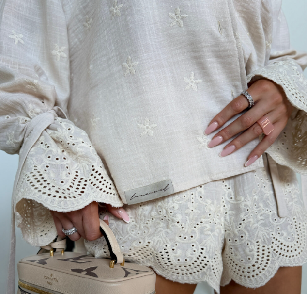 Lekkość, która przyciąga detalem. Zwiewna koszula o luźnym kroju subtelnie układa się na sylwetce, tworząc naturalny, niewymuszony efekt, a haftowane wykończenia dodają całości romantycznego charakteru. Szerokie rękawy zakończone ozdobną koronką podkreślają wyjątkowość formy i nadają stylizacji wyrazistości. Szorty z ażurowym wykończeniem eksponują nogi i wprowadzają letni, świeży vibe, jednocześnie zachowując komfort dzięki elastycznej talii. Całość tworzy spójny, kobiecy look idealny na ciepłe dni – lekki, ale dopracowany w każdym detalu.