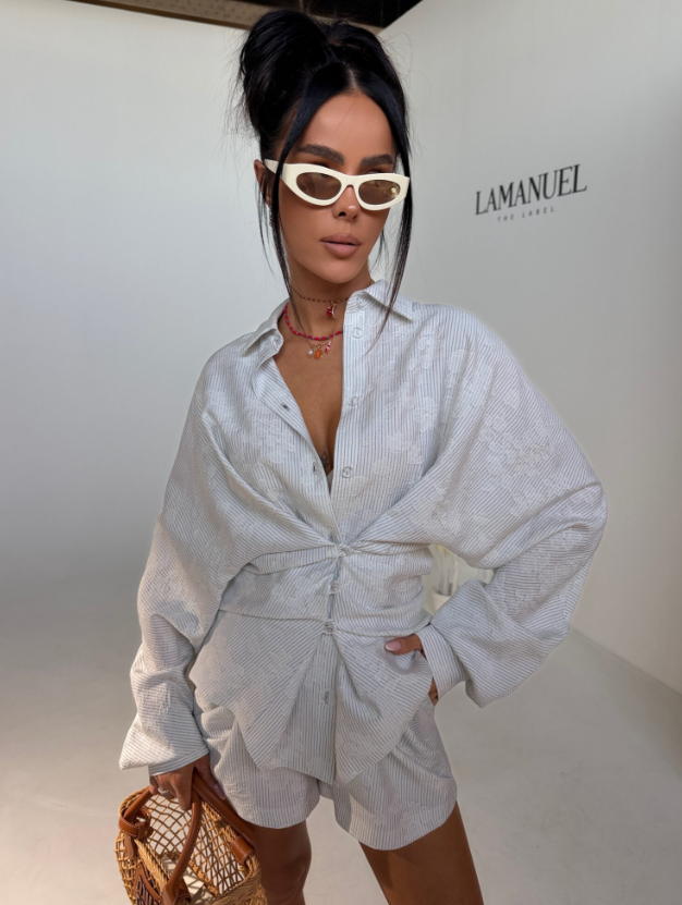Swobodna forma z dopracowanym detalem, który zmienia charakter całej sylwetki. Luźniejsza, wydłużona koszula daje efekt lekkości i nonszalancji, a dzięki zapięciu na guziki po bokach można ją modelować w talii, podkreślając proporcje i nadając bardziej kobiecej linii. Delikatna struktura materiału dodaje głębi i subtelnej elegancji, zachowując przy tym codzienny komfort. Szorty z podwójną gumą w pasie idealnie dopasowują się do sylwetki, zapewniając wygodę i stabilne ułożenie. Całość tworzy nowoczesny, lekko wakacyjny look, który łączy luz z wyrafinowanym wykończeniem.