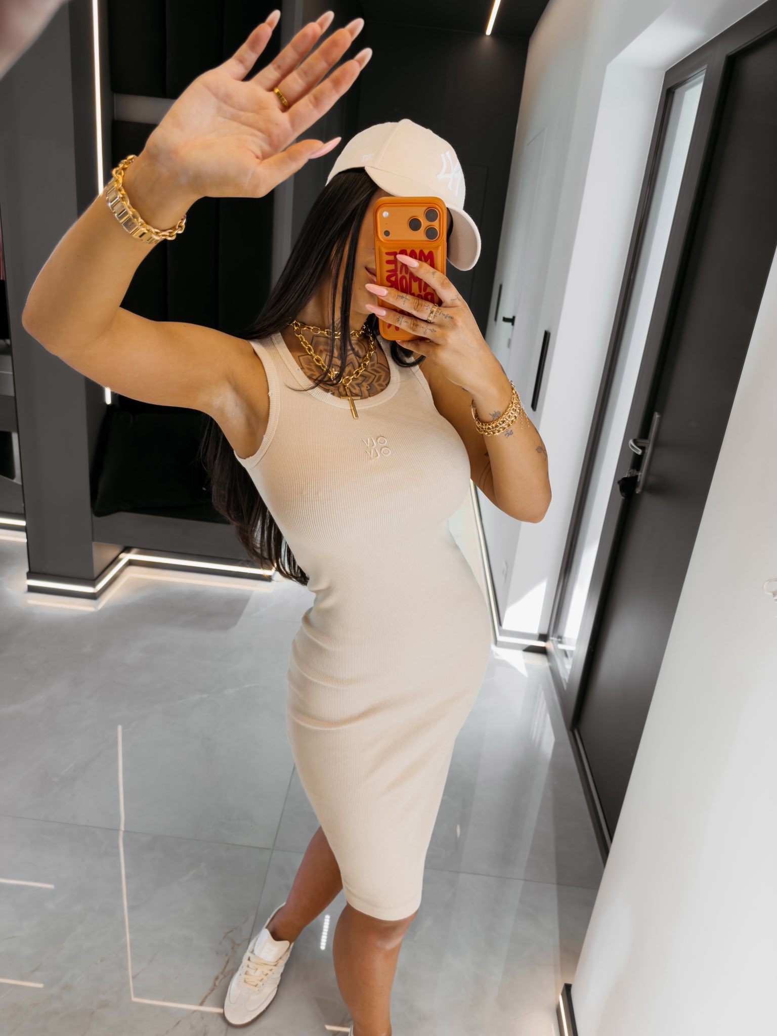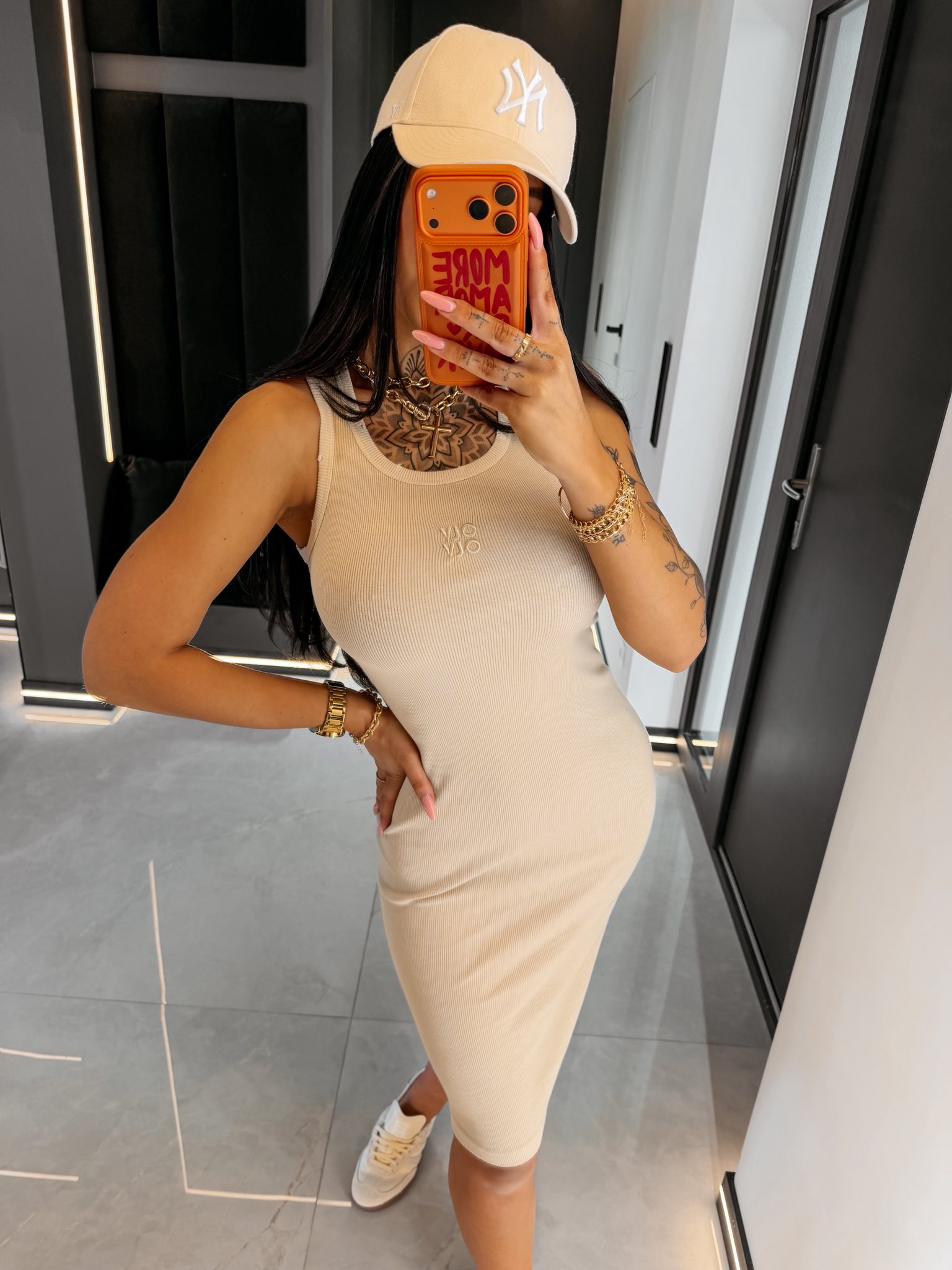 Fason bodycon - długość midi - okrągły dekolt typu tank - delikatne centralne logowanie OLV - materiał prążkowany - brzegi dekoltu wykończone lamówką z efektem distressed