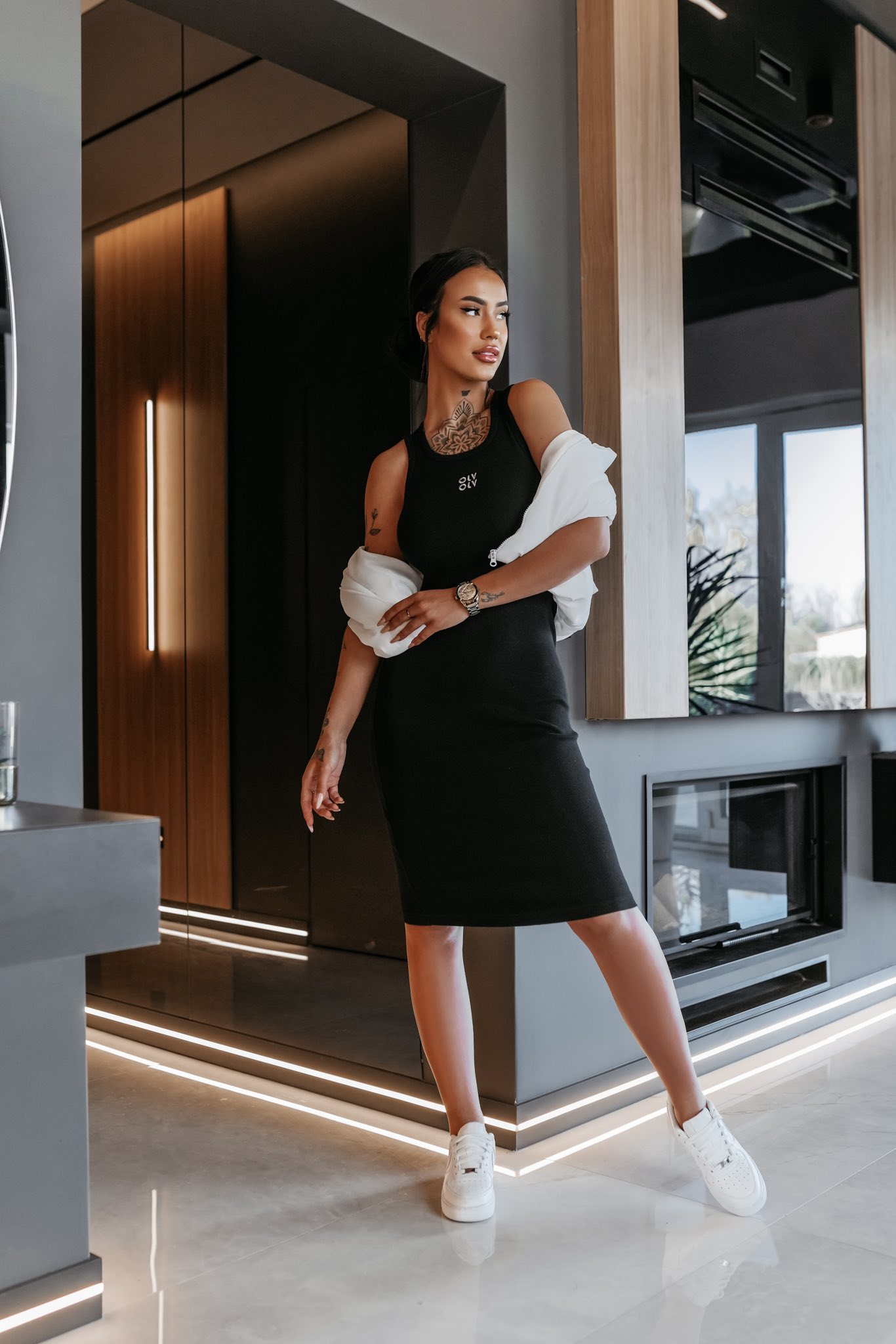Fason bodycon - długość midi - okrągły dekolt typu tank - delikatne centralne logowanie OLV - materiał prążkowany - brzegi dekoltu wykończone lamówką z efektem distressed