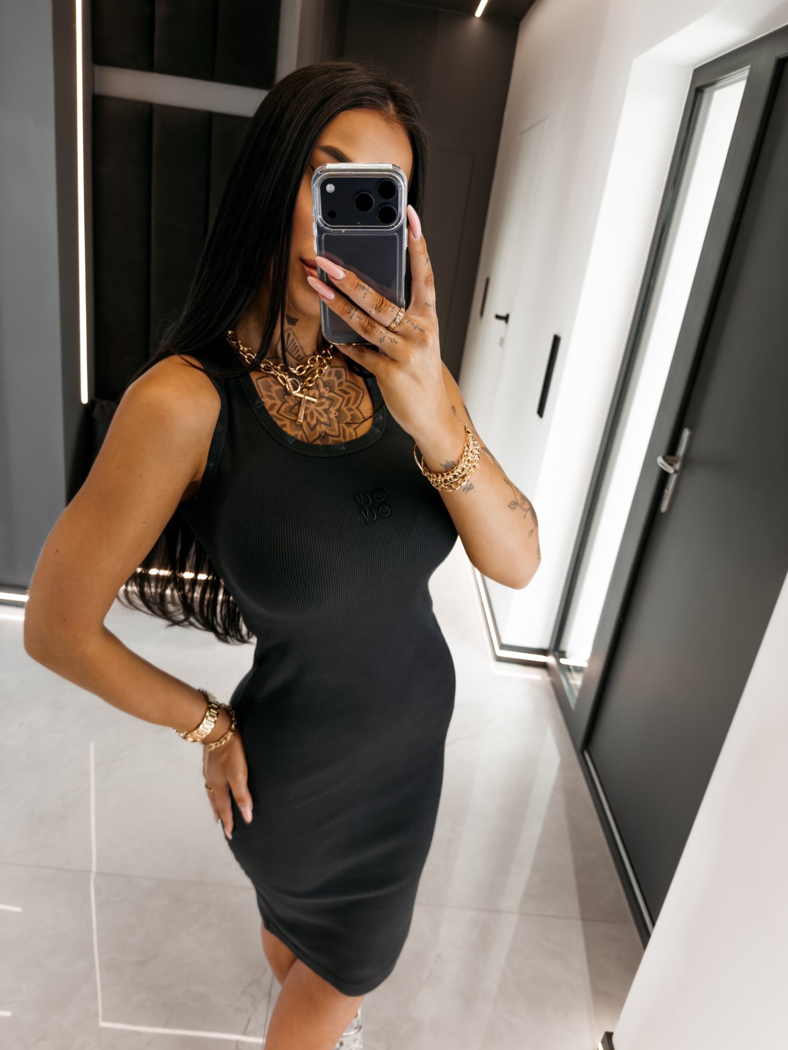 Fason bodycon - długość midi - okrągły dekolt typu tank - delikatne centralne logowanie OLV - materiał prążkowany - brzegi dekoltu wykończone lamówką z efektem distressed