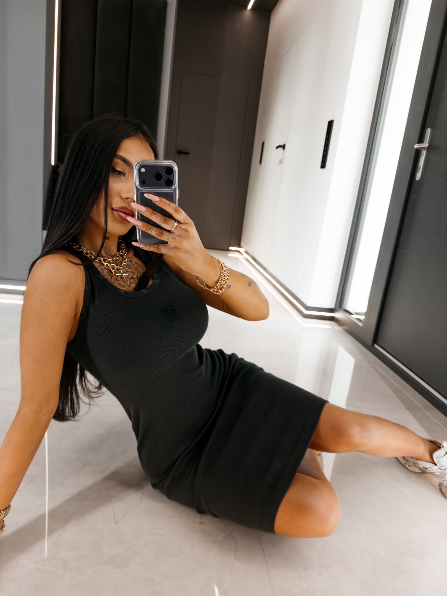 Sukienka dopasowana o długości midi wykonana z prążkowanej dzianiny, bez rękawów, z okrągłym dekoltem, elastyczny materiał, haftowane logo na przodzie.