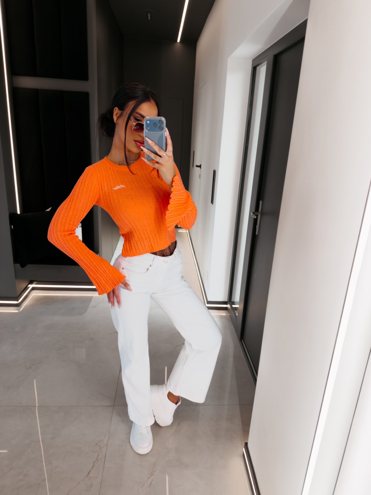 Dopasowany fason o krótszej formie - okrągły dekolt - długie rękawy zakończone rozcięciami - prążkowana struktura materiału - subtelne haftowane logo brandu