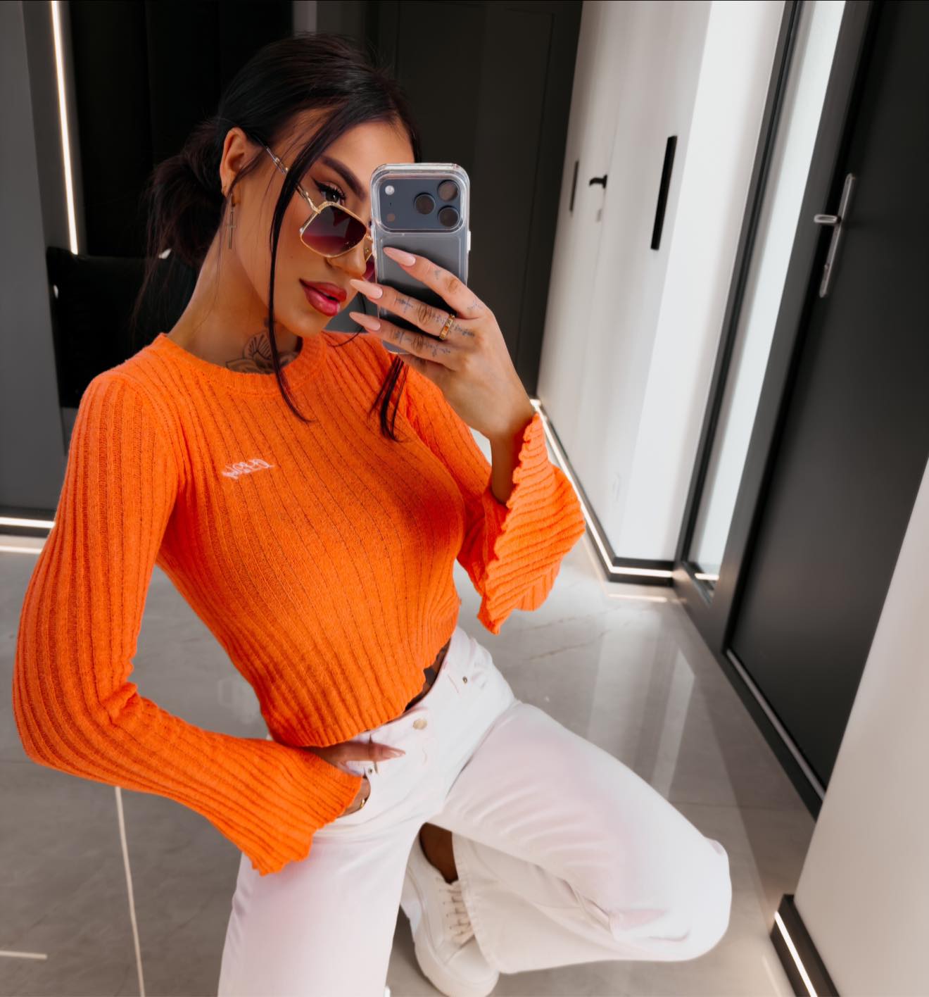 Sweter z prążkowanej dzianiny, dopasowany krój, długość krótka, okrągły dekolt, długie rękawy z rozszerzeniem przy mankietach, elastyczny materiał, subtelne logo na przodzie.