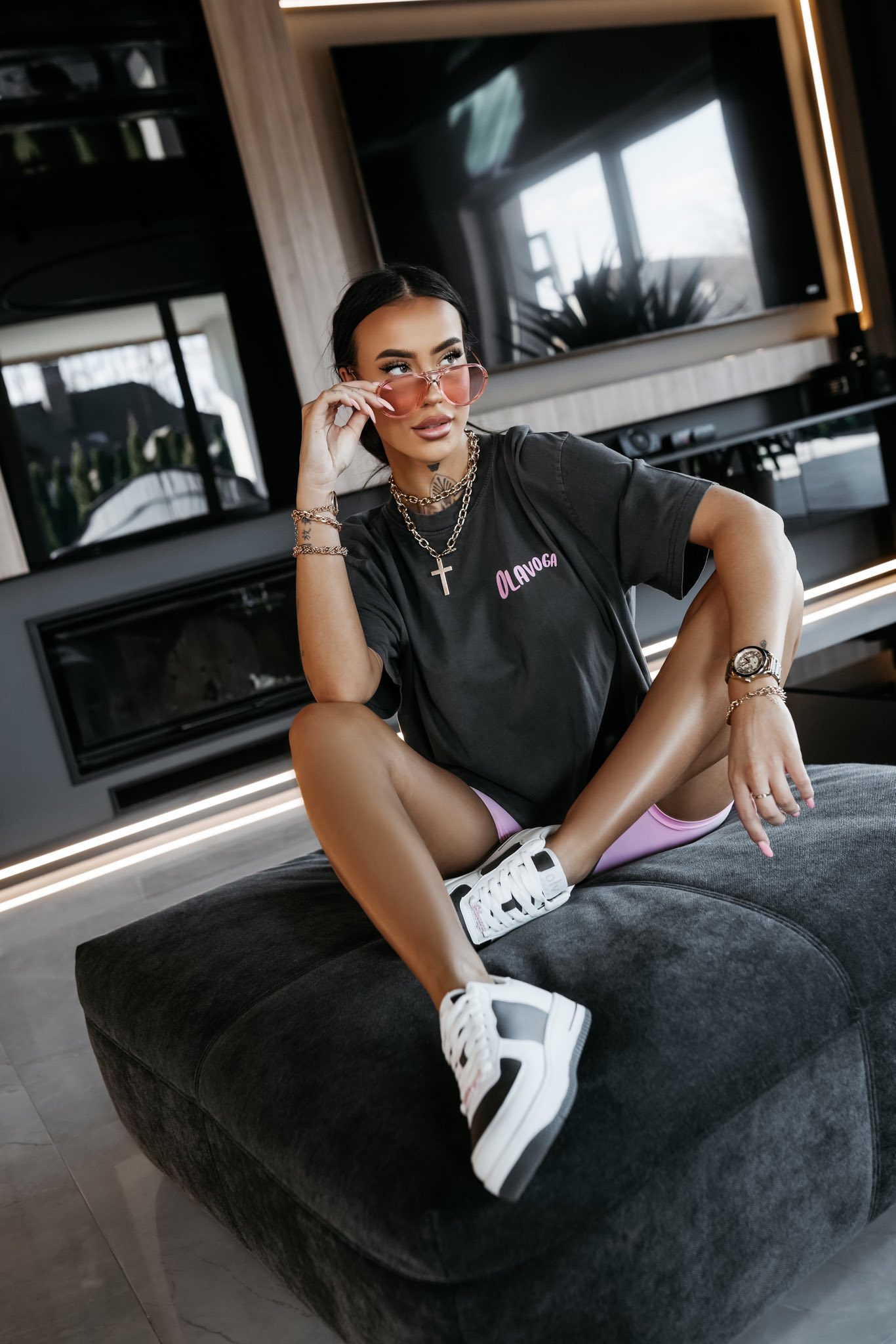 Oversize'owy krój - miękka wysokogatunkowa bawełna - krótki rękaw - klasyczny okrągły dekolt -obniżona linia ramion - duży kontrastowy nadruk brandu na plecach oraz mniejsze logo na przodzie wykonane w strukturalnej formie dającej trójwymiarowy efekt.