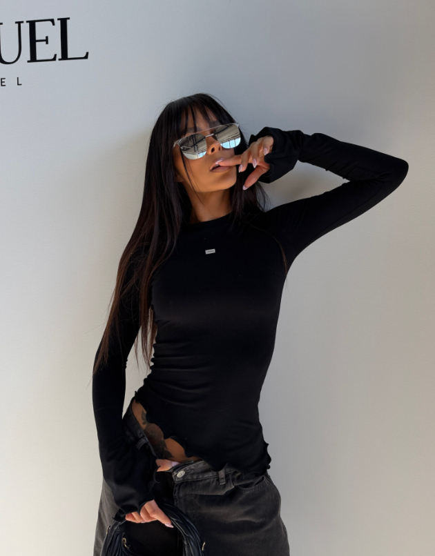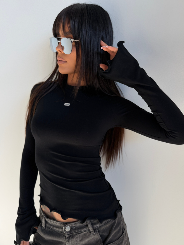 Top, który wygląda niepozornie, ale robi stylizację. Dopasowany fason z miękkiej, lejącej dzianiny, która otula sylwetkę bez oporu. Falowane wykończenie nadaje mu lekkości i dziewczęcego pazura – działa zarówno na gołe ciało, jak i jako baza pod marynarkę. Długi rękaw z przedłużeniem, który lekko nachodzi na dłoń, dodaje mu nonszalancji w stylu old Céline. Minimalistyczna metka lamanuel na środku to subtelne nawiązanie do estetyki premium. Ten model potrafi wyglądać ultra codziennie, ale też zaskoczyć wieczorem.