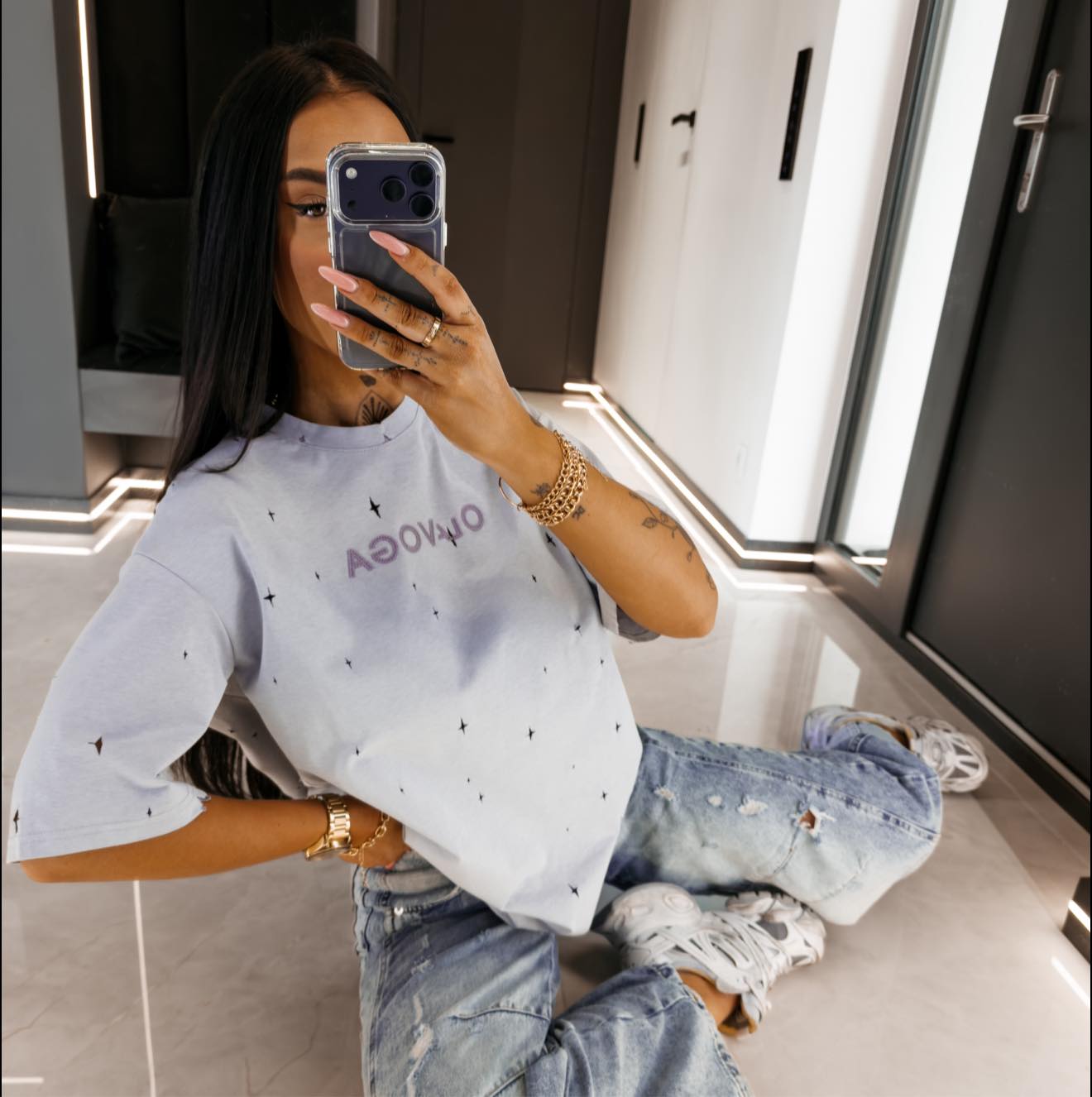 Fason regular fit - przedłużona forma - obniżona linia ramion - krótkie rękawy o swobodnym kroju - na całej powierzchni drobne perforacje w formie gwiazdek odsłaniające kontrastowy kolor spodniej warstwy - na przodzie drobne teksturowane haftowane logo
