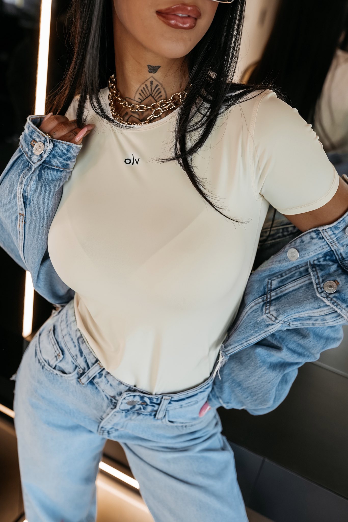 Fason slim fit - zachowany w estetyce basic premium - klasyczny krótki rękaw - lekko zaokrąglony dekolt - wykonany z lekkiej technicznej elastycznej tkaniny - na froncie minimalistyczny nadruk logo OLV.