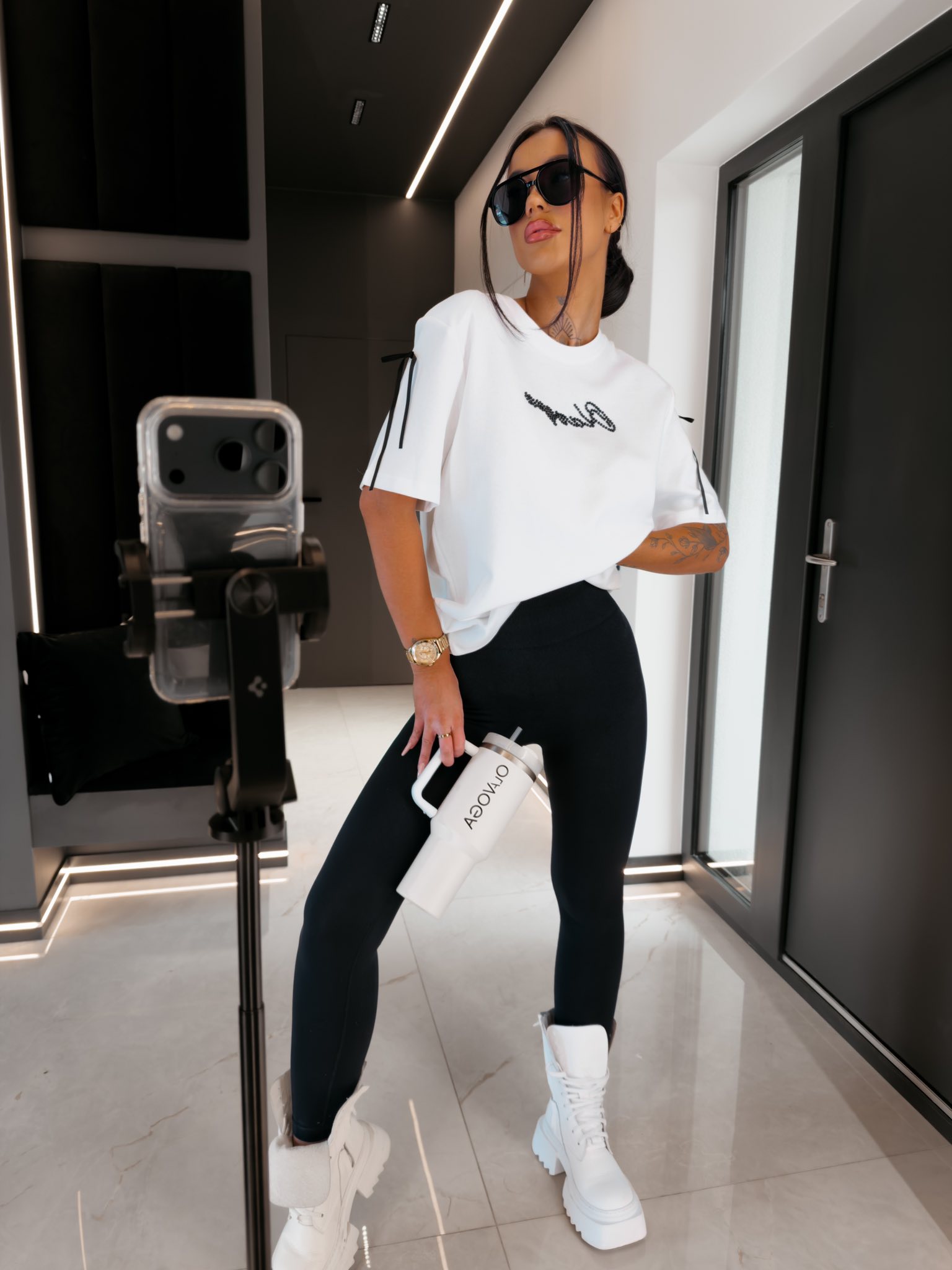 Fason oversize - przedłużona forma - wysokogatunkowa tkanina - okrągły dekolt wykończony ściągaczem - krótki luźny rękaw z kontrastowymi wiązaniami - poduszki wszyte na ramionach - na przodzie aplikacja z perełek w kontrastowym kolorze układająca się w logo OLAVOGA - gładka struktura materiału - proste wykończenie dołu