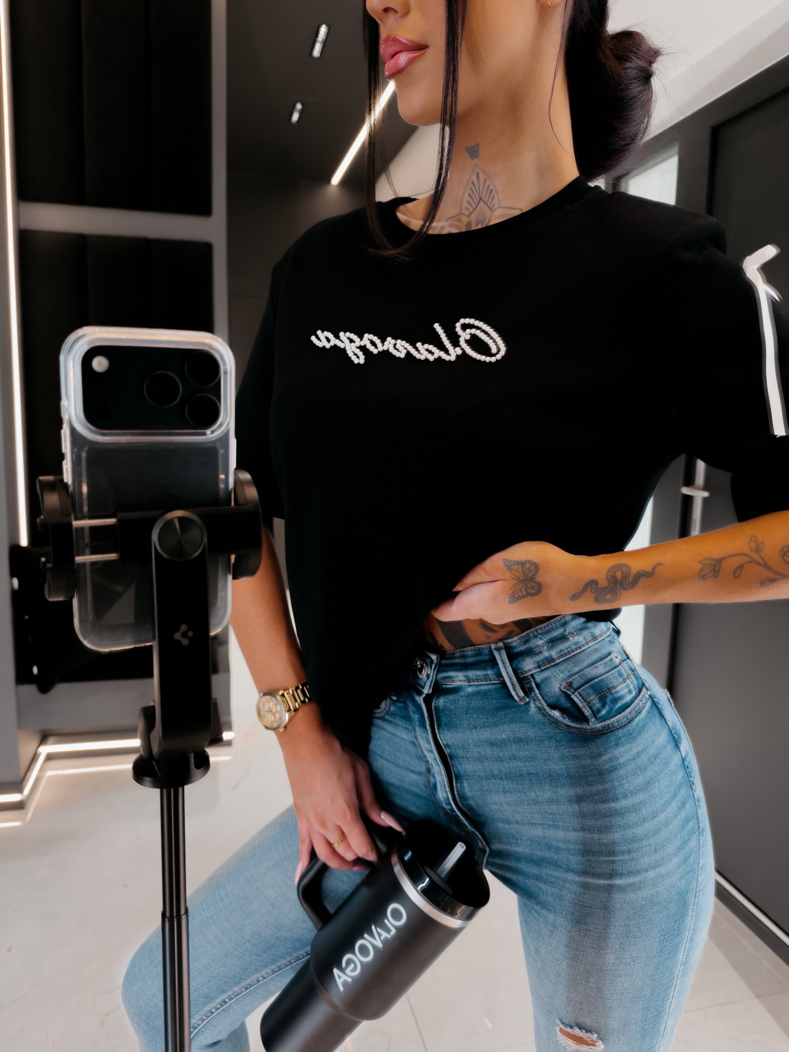 Fason oversize - przedłużona forma - wysokogatunkowa tkanina - okrągły dekolt wykończony ściągaczem - krótki luźny rękaw z kontrastowymi wiązaniami - poduszki wszyte na ramionach - na przodzie aplikacja z perełek w kontrastowym kolorze układająca się w logo OLAVOGA - gładka struktura materiału - proste wykończenie dołu